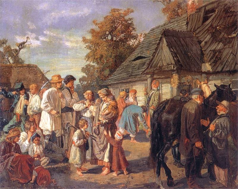 На картине — фольварк в день получки. Группа крестьян в центре получила гроши за свою работу, они плачут, не знают, как на эти деньги прокормить детей. Правда, два хлопа слева на заднем плане выглядят вполне весёлыми, наверное, успели накатить.
